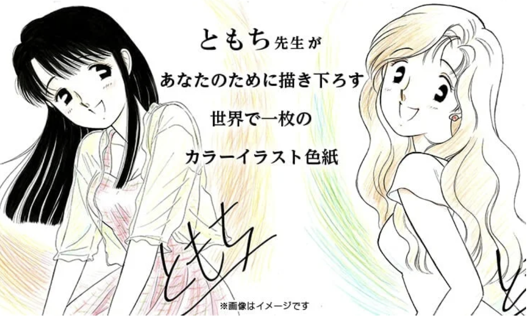 ともち先生は、「だいすき!」「愛をあげよう」などの代表作で知られる人気イラストレーターです。今回の販売では、セミオーダーのカラーイラスト色紙に加えて、「愛をあげよう」から各限定1枚の販売となる完成品カラーイラスト色紙(3種)の2つの商品がラインナップされています。