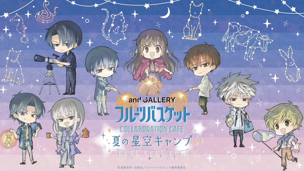 コラボカフェでは、TVアニメ『フルーツバスケット』の世界観を楽しむことができ、オリジナルイラストや作中の夏のエピソードからインスピレーションを得たメニューやオリジナルグッズが登場します。コンセプトは「夏の星空キャンプ」で、キャラクターたちが花火やランタンなどを持ちながら夏夜のキャンプを楽しむ様子が描かれています。