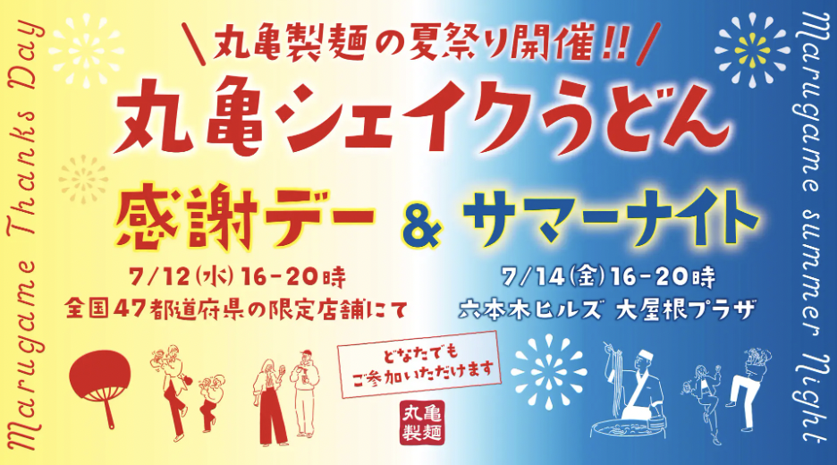 株式会社丸亀製麺は、7月12日(水)と7月14日(金)の2日間、全国47都道府県で「丸亀シェイクうどん感謝デー…
